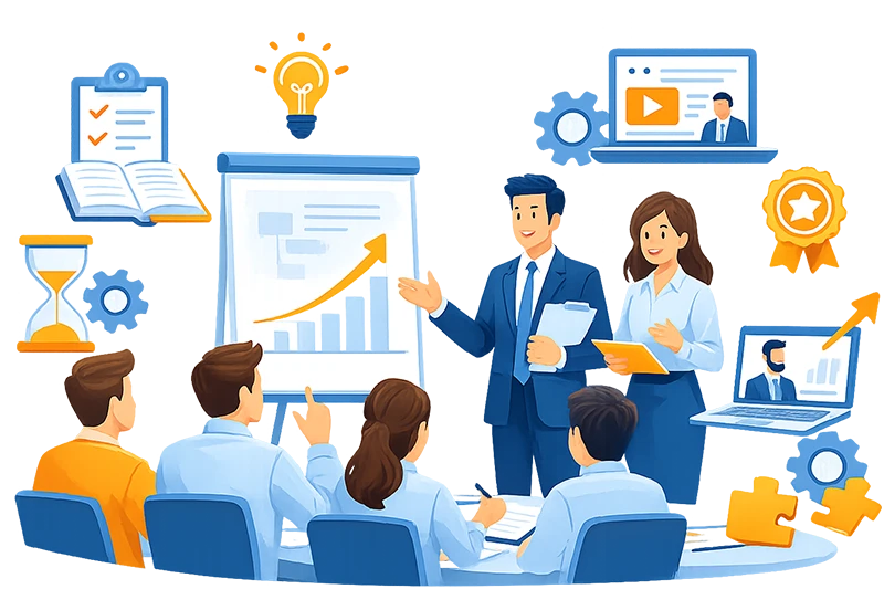 Adaptamos nuestra capacitación a la estrategia única de tu empresa, enfocándonos en proyectos estratégicos para potenciar el desarrollo de tu equipo.